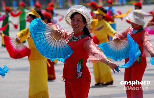 图为厦门市民在烈日下欢歌起舞,迎接圣火。 中新社发 傅丹丹 摄