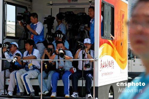 图为采访车上的记者严阵以待,拍摄圣火传递。中新社发 傅丹丹 摄