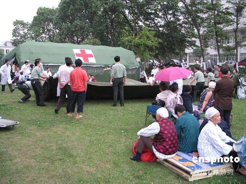 四川汶川县发生7.8级地震。成都受到波及,也发生5.4级地震。位于成都北郊的成都军区总医院接收了来自地震灾区的100多名伤员。在积极组织抢救的同时,医院搭建10余顶大型帐篷,将住院的1000多名患者全部安全转移。中新社发 朱琥 摄