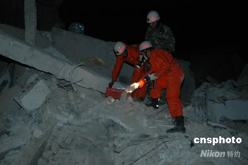 12日下午2:30左右,受四川汶川地震波及,重庆市梁平县文化镇一小学教学楼发生垮塌。13日凌晨1时许,记者从梁平县政府办公室获悉,目前搜救工作已全部结束,垮塌造成5人死亡,36人受伤。图为消防人员正利用生命探测器对废墟下的伤员进行探测。 中新社发 郭虹 摄
