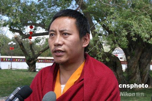 四川汶川大地震发生后,引起西藏宗教界极大关注,5月13日,拉萨哲蚌寺部分僧人代表在参观完“三·一四”暴力事件中被烧毁的拉萨市第二中学教学楼、被毁店铺和新改近造完工的罗布林卡广场等处后表示,明天该寺将举行主题祈福法会,为四川汶川地震灾区民众祈福。图为僧人平措塔青在祝福灾区民众。中新社发 柳俊武 摄