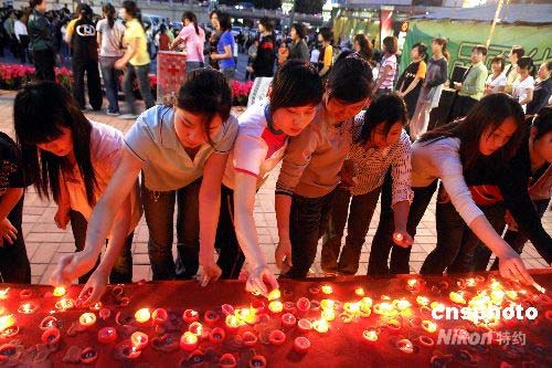 2008年5月13日,郑州市紫荆山百货门前,商场员工点起512支蜡烛,在烛光中,商场员工为汶川地震灾区的受灾群众祈福,并且现场通过红十字会为灾区捐款,表达爱心。中新社发 马健 摄