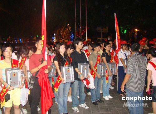 5月13日晚上八点,由海南青年志愿者协会、省红十会、志愿海南爱心分社和海南电视台《鹩哥》栏目组织30多位自愿者,走上街头为四川地震灾区募捐善款。图务志愿者作出发募捐前的准备。中新社发 付美斌 摄