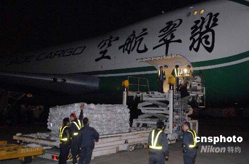 五月十三日深夜,深圳航空旗下的中德合资翡翠航空大型货机JI7452受命紧急运输救灾物资,四千顶帐篷从天津滨海机场连夜装机起运,专机运往四川地震灾区。中新社发 陈文 摄