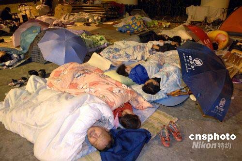 五月十四日凌晨,成都地震灾区众多民众为预防地震再次来袭,露宿街头立交桥下。中新社发 陈文 摄