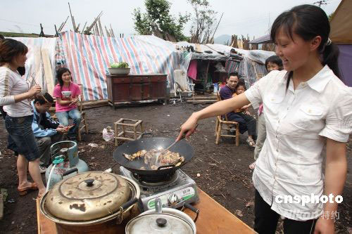 在四川大地震中幸存下来的灾民目前生活基本稳定,图为5月14日,什邡市洛水镇民众在临时住所旁作饭。