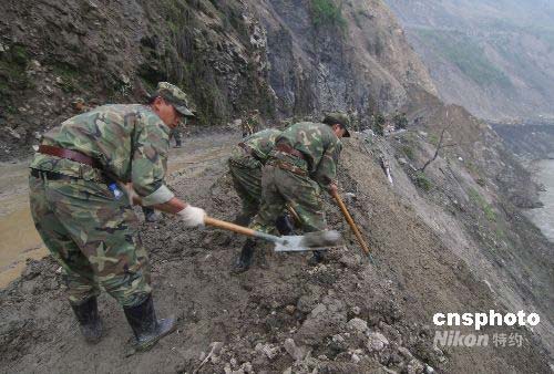 武警在抢修到汶川县映秀镇的公路。中新社发 郭国权 摄