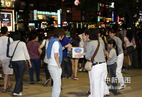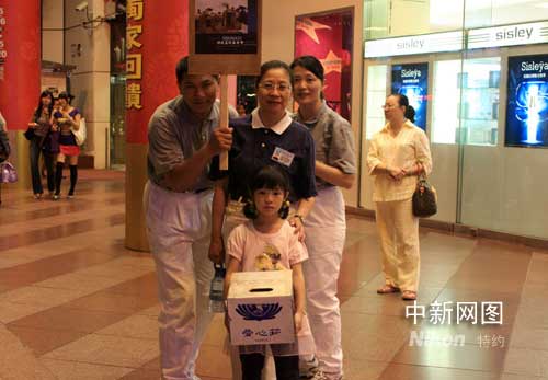 十七日晚,慈济台北分会的义工在台北市的街上为四川震灾与缅甸风灾募款,儿童也加入行列。作 者:陈立宇