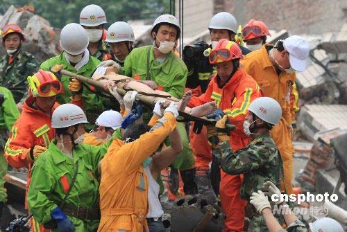 5月17日,上海公安消防救援队在四川映秀镇映秀湾发电厂的映电宾馆废墟里,发现有生命迹象。经过10个多小时的紧张营救,终于在18时15分将20岁的蒋雨航成功救出,他在废墟里存活了124个小时,其父母也在当日下午从贵州赶到现场。中新社发 盛佳鹏 摄