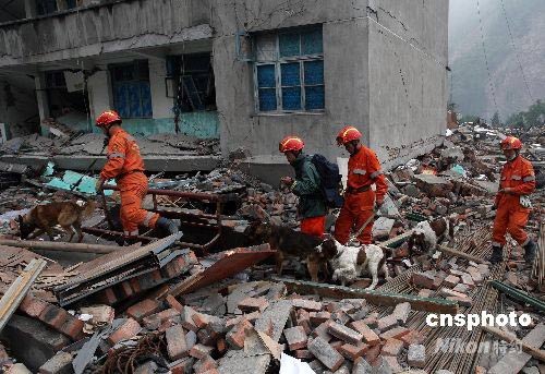 通往四川省汶川地震核心重灾区映秀镇的简易公路5月17日打通后,各路专业救援队继续在废墟中寻找可能的幸存者。中新社发 任晨鸣 摄