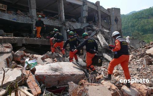 5月19日,中韩两国救援队员四川什邡蓥华镇一处楼房废墟上,联手搜救被困者。 中新社发 张晓理 摄