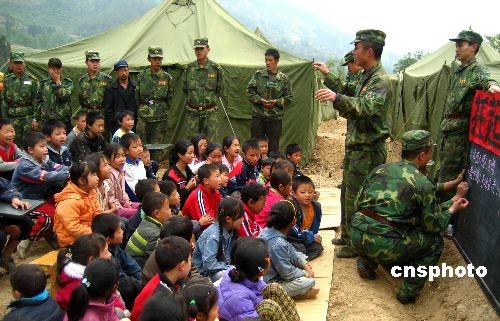 5月20日,四川省平武县南坝镇垭头坪村,解放军某装甲师炮兵团在这里建立的“托起明天的太阳”灾区战地小学正式开课。图为战士刘杰在给孩子们上课。 中新社发 汪景磊 摄