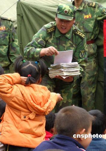 5月20日,四川省平武县南坝镇垭头坪村,解放军某装甲师炮兵团在这里建立的“托起明天的太阳”灾区战地小学正式开课。图为政委汪应成给孩子们发课本。 中新社发 汪景磊 摄