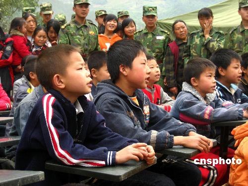 5月20日,四川省平武县南坝镇垭头坪村,解放军某装甲师炮兵团在这里建立的“托起明天的太阳”灾区战地小学正式开课。图为孩子们踊跃回答问题。 中新社发 汪景磊 摄