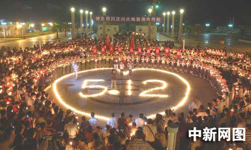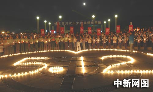 5月20日是全国哀悼日三天中的第二天,在浙江温州市百岛洞头新城广场上,洞头县消防大队的官兵们点燃祭奠逝者的烛台,摆放成含有5月12日标志的心型,让5月12日不幸遇难的同胞以及为了灾区安危舍身救人的消防官兵,为中国所铭记。哀伤的气氛在广场弥漫,广场上的人们默默地守护着自己手中的烛光,低头默哀,他们希望通过这种方式将地震遇难同胞通往天堂的路照亮,将受灾地区抗灾自救的路照亮。(江耘 林加佳 林加杰)