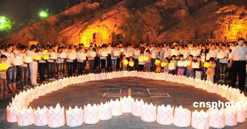 5月20日,全国哀悼日第二天,河南省洛阳市龙门石窟职工以及学生志愿者到卢舍那大佛前的伊河上放800余盏河灯,他们通过传统的放河灯形式对四川地震遇难者寄予哀思。