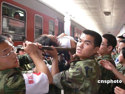 5月21日早7时许,一列运送四川地震伤员的专列徐徐驶入西安客运站,早已等待就绪的医务人员马上将伤员转送至医院接受治疗。据了解,这列运送伤员的专列是20日下午4时从四川绵阳发车的,车上共有伤员248人,车上解放军第四军医大学专门抽调了30余名医务人员全程陪护,到达西安客运站后,伤员将被救护车全部接到第四军医大学附属医院西安西京医院和唐都医院接收治疗,目前西京医院已经提前准备了500张床位以收治更多的地震伤员。中新社发 杨志涛 摄