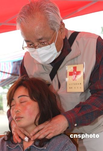 5月21日下午,台湾红十字医疗队在四川省广汉市高坪镇灾民安置中心安营扎寨开展医疗救治。78岁的原台北市医师工会理事长彭芳谷先生在高坪镇中心医院紧急抢救一名在地震中受重伤产生“气胸”的中年女患者,并指导医疗队医生为期实施外科手术。中新社发 任晨鸣 摄