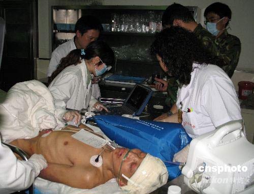 5月21日,四川省绵竹县被埋8天8夜零4小时(196个小时)的天池煤矿矿工赖元平被救出,经解放军255医院医疗队急救后由成都军区直升飞机接至成都军区总医院救治。伤者在该院作CT检查时被发现脑有内巨大血肿,时刻有生命危险,成都军区总医院顾建文副院长和解放军301总医院周定标教授研究后决定立即手术。手术由顾建文副院长主刀,1小时40分钟后手术完成,术后伤员生命体症平稳。中新社发 朱琥姚远 摄