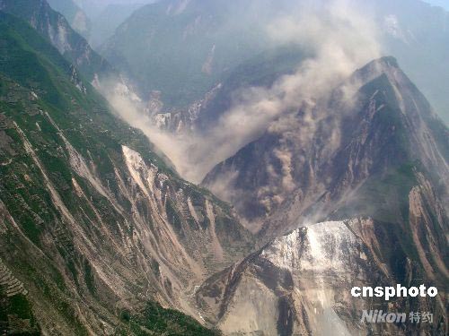 五月二十三日是汶川大地震第十二天,震中区的高山上依然不断发生山体滑坡,泥石滚滚,烟雾腾腾。中新社发 刘小青 摄