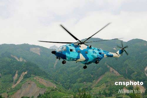 5月19日,南空某搜救团直升机在四川地震灾区进行搜救工作。中新社发 贲道春 摄