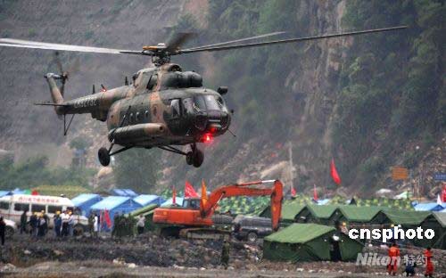 5月21日,运满伤员的军用直升机降落在映秀临时救助点。中新社发 曾宪平 摄