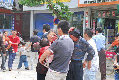 5月12日14点41分:跑到街上避震的受伤群众。董开国摄