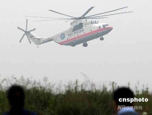 5月25日下午5时45分,俄罗斯米格—26大型运输机飞抵绵阳机场,支援唐家山堰塞湖排险工作。中新社发 赵振清 摄