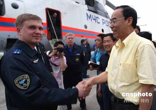 图为机长安东(左)在机场受到绵阳市人大主任杨步润的迎接。中新社发 赵振清 摄