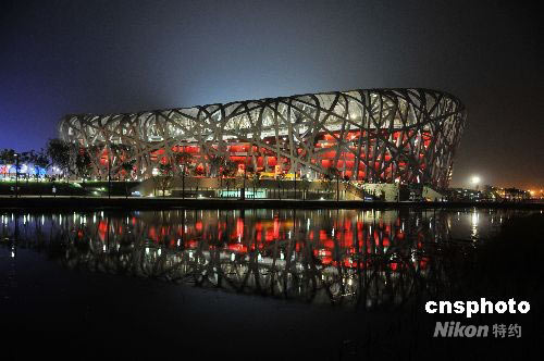 5月22日至25日,“好运北京”2008中国田径公开赛在国家体育场“鸟巢”举行。比赛期间的夜晚,国家体育场灯火辉煌,周边湿地湖水映衬着“鸟巢”,显得分外秀丽。中新社发 冯军 摄