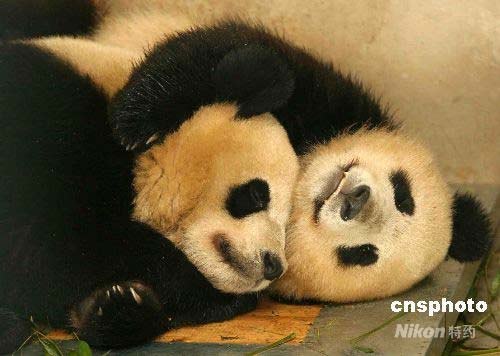 5月26日,来自四川卧龙的8只奥运大熊猫在北京动物园开始了新的生活。此次进京的8只奥运大熊猫,是今年3月21日启动的“2008四川卧龙大熊猫奥运北京行”投票评选活动中,由广大网民从16只大熊猫里选出来的。这8只熊猫,雌雄各半,现在的年龄都在1岁9个月之间,属亚成体,正是最活泼可爱的年华。图为两只大熊猫在互相依偎着休息。 中新社发 富田 摄