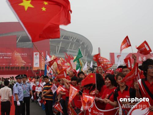 5月27日,奥运圣火在南京传递,群众热烈欢迎。 中新社发 牛莉 摄
