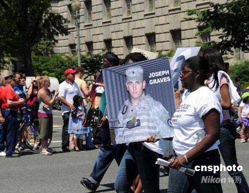 一些反战组织也举行了反战示威,他们高举在伊拉克战场上阵亡的士兵画像,要求布什政府尽快撤军。中新社发 邱江波 摄