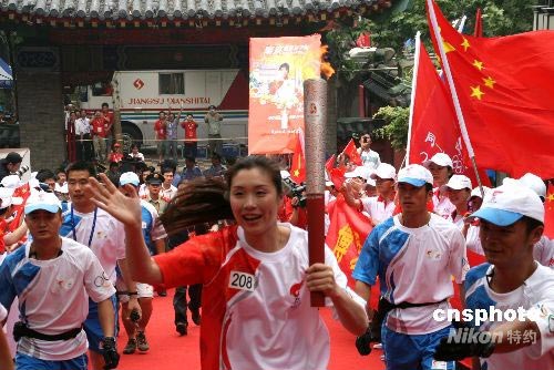 5月27日10时25分,奥运圣火在南京站传递,女排前国手孙玥为最后一棒火炬手。中新社发 崔佳明 摄