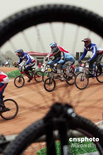 2008国际自行车联盟BMX(小轮车)世界锦标赛将于5月28日晚在山西省太原市拉开战幕。33个国家的870多名运动员参加此次比赛。5月27日上午,先期到达的国外运动员抓紧时机,熟悉场地。中新社发 张云 摄
