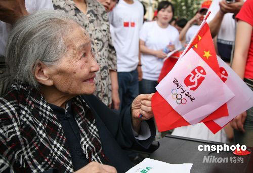 图为百岁老人手持国旗与周围的群众一道为火炬传递加油。 中新社发 钟山 摄