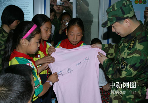 八一帐篷学校学生杨盼盼、赵珊、母卓欣用一晚上的时间在送给杨利伟的T恤上绣上了“万众一心”四个字。 秦宪安 摄