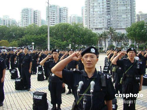 5月31日上午8时,海口200名特警南港码头登船出征,奔赴四川抗震救灾。此次出征特警要到达四川德阳市,为期3个月,主要职责是协助当地公安机关巡逻防控、打击违法犯罪活动、恢复110、119、122接处警和服务灾民工作。中新社发 付美斌 摄