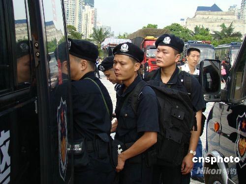 图为海口特警队员登车出发。中新社发 付美斌 摄