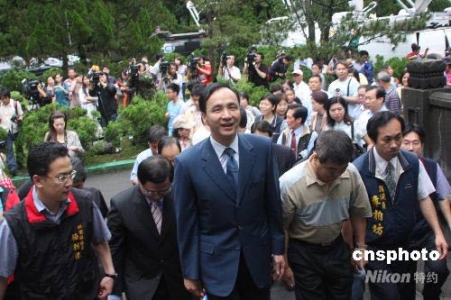 图为桃园县长朱立伦(右三)率众进入慈湖陵寝。中新社发 耿军 摄