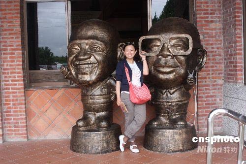 县府观光营销处特地制作的大型Q版蒋大头及蒋小国模型吸引游客拍照。中新社发 耿军 摄