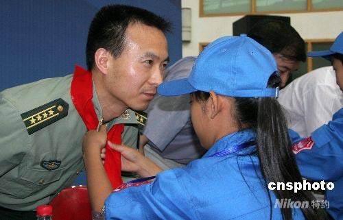 图为小营员为费俊龙系上红领巾。