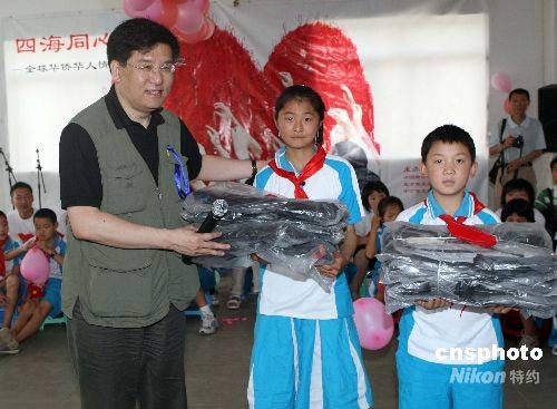 中国新闻社副总编辑章新新向灾区儿童赠送书包等学习用具。中新社发 毛建军 摄