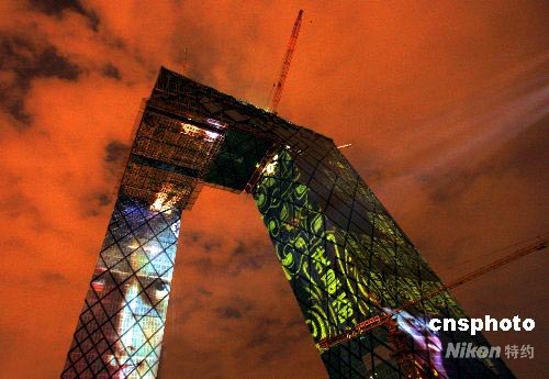 图:巨型投影扮靓央视新址 体育精神鼓舞中国加油 (2)