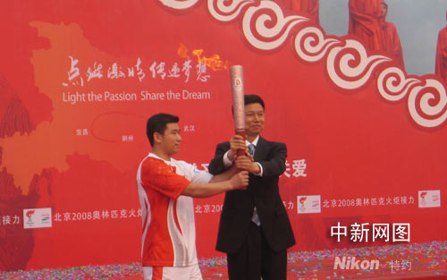 六月二日上午八时十二分,北京奥运会火炬接力荆州传递开始,该市传递路线全长为十八点八公里。图为体操奥运冠军郑李辉从中共荆州市委书记应代明手中接过火炬开始第一棒传递。 中新社发 艾启平 摄