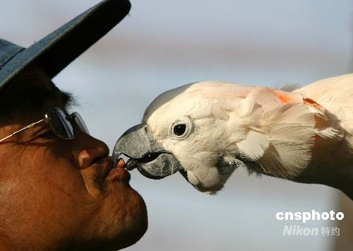 2008年6月1日,在山东西霞口神雕山野生动物园百鸟园内,一只鹦鹉从一位老人嘴中抢食,这种人、鸟和睦共处有趣的绝技表演,吸引着众多游客前来观赏。中新社发 郭光耀 摄