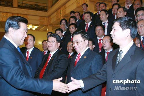 6月2日,全国台湾同胞投资企业联谊会(台企联)一届二次会议在北京人民大会堂举行,中共中央政治局常委、全国政协主席贾庆林出席会议并与参会代表合影留念。中新社发 廖文静 摄