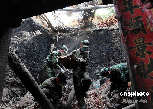 6月2日,进村入户参加抗震救灾的铁军官兵在海拔2000多米高的汶川县威州镇布瓦村村民王健华家清理在地震中倒塌的房屋。中新社发 曾宪平 摄