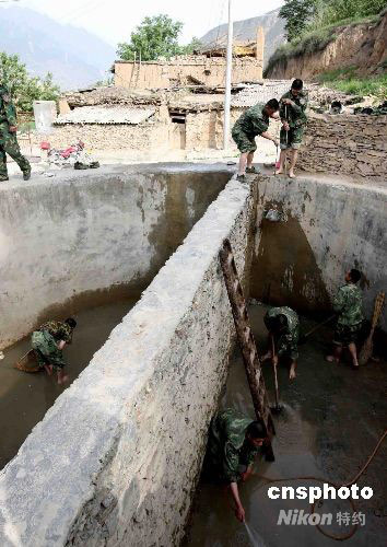 6月2日,参加抗震救灾的铁军官兵在海拔2000多米高的汶川威州镇布瓦村帮助灾民清理储水井。中新社发 曾宪平 摄