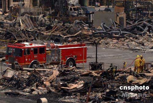 当地时间六月二日,消防员在火灾废墟现场处理善后。一日凌晨,洛杉矶著名的环球影城发生大火,持续十几个小时的大火焚毁了影城部分外景设施,备受游客喜爱的主题公园“金刚”景点也被付之一炬,过火面积约三点五英亩。中新社发 张炜 摄